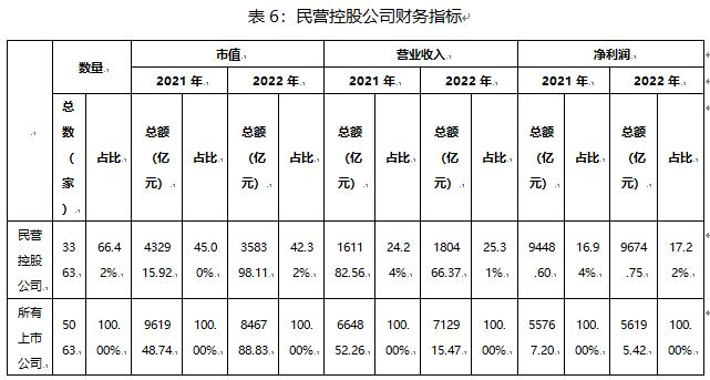 2022年,民營(yíng)控股公司依舊是資本市場(chǎng)的主力軍,公司數(shù)量達(dá)3363家,占上市公司總數(shù)的66.42%,總市值達(dá)35.84萬(wàn)億元,占A股總市值的42.32%。此外,民營(yíng)控股公司的成長(zhǎng)活力也獲得持續(xù)激發(fā),營(yíng)業(yè)收入的占比從24.24%增至25.31%,凈利潤(rùn)的占比從16.94%增至17.22%,創(chuàng)收創(chuàng)利水平穩(wěn)定上升,為上市公司發(fā)展積聚了內(nèi)在動(dòng)力。2022年,民營(yíng)控股公司繳納了0.88萬(wàn)億稅費(fèi),占上市公司繳納稅費(fèi)總額的18.45%。