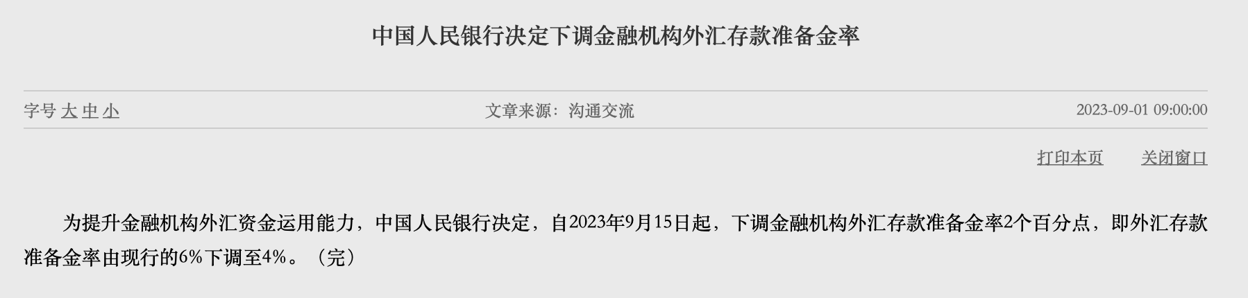 為提升金融機(jī)構(gòu)外匯資金運(yùn)用能力,中國(guó)人民銀行(下稱“央行”)決定,自2023年9月15日起,下調(diào)金融機(jī)構(gòu)外匯存款準(zhǔn)備金率2個(gè)百分點(diǎn),即外匯存款準(zhǔn)備金率由現(xiàn)行的6%下調(diào)至4%。