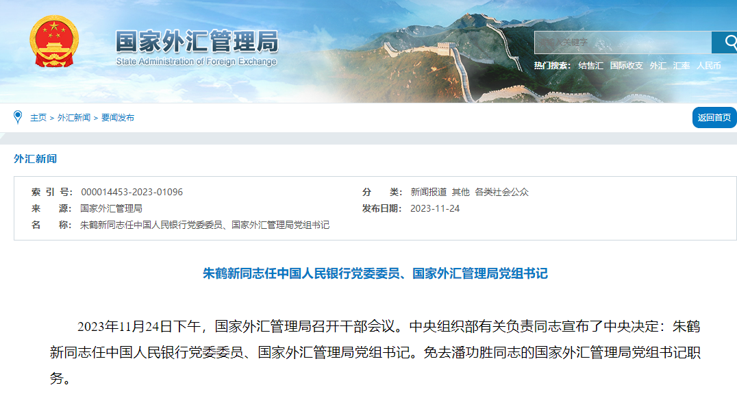 2023年11月24日,國家外匯管理局召開干部會議,中央組織部有關負責同志宣布了中央決定:朱鶴新任中國人民銀行黨委委員、國家外匯管理局黨組書記。