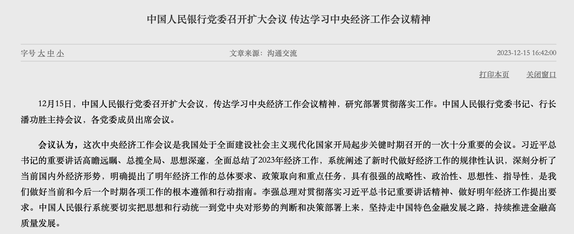 12月15日,中國人民銀行黨委召開擴(kuò)大會議,傳達(dá)學(xué)習(xí)中央經(jīng)濟(jì)工作會議精神,研究部署貫徹落實(shí)工作。會議強(qiáng)調(diào),做好明年的經(jīng)濟(jì)金融工作,要堅持穩(wěn)中求進(jìn)工作總基調(diào),完整、準(zhǔn)確、全面貫徹新發(fā)展理念,加大宏觀調(diào)控力度,保持貨幣政策的穩(wěn)健性,防范化解金融風(fēng)險,深化金融改革開放,切實(shí)增強(qiáng)經(jīng)濟(jì)活力,改善社會預(yù)期,鞏固和增強(qiáng)經(jīng)濟(jì)回升向好態(tài)勢,持續(xù)推動經(jīng)濟(jì)實(shí)現(xiàn)質(zhì)的有效提升和量的合理增長。著重抓好以下工作任務(wù):