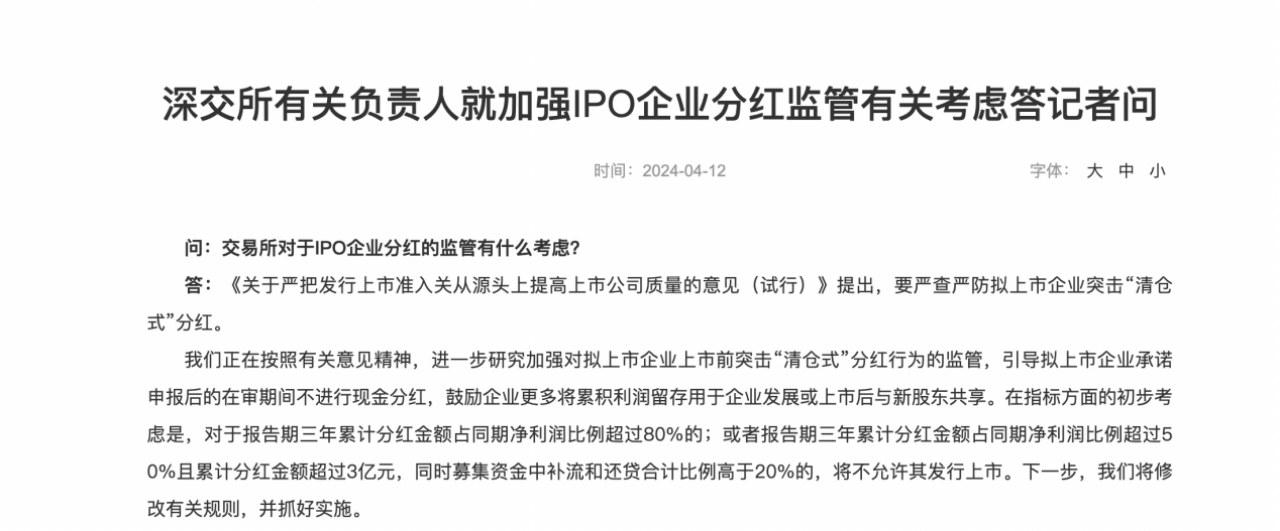 4月12日,滬深交易所有關負責人就加強IPO企業(yè)分紅監(jiān)管有關考慮答記者問。