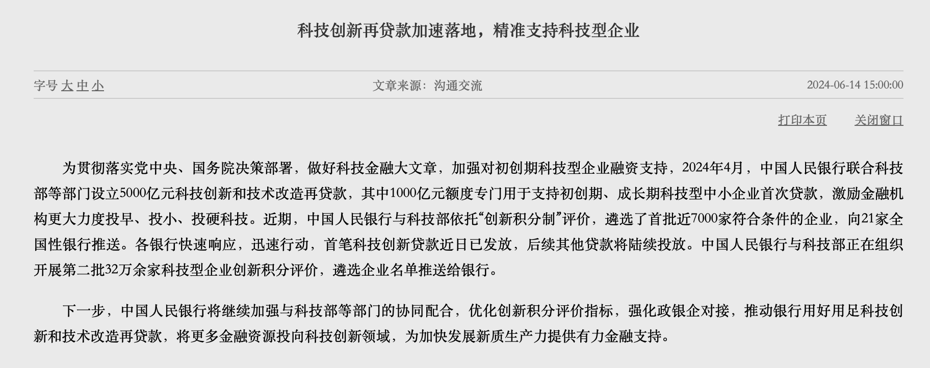 本報(bào)訊 (記者劉琪)6月14日,中國(guó)人民銀行發(fā)布消息,為貫徹落實(shí)黨中央、國(guó)務(wù)院決策部署,做好科技金融大文章,加強(qiáng)對(duì)初創(chuàng)期科技型企業(yè)融資支持,2024年4月,中國(guó)人民銀行聯(lián)合科技部等部門設(shè)立5000億元科技創(chuàng)新和技術(shù)改造再貸款,其中1000億元額度專門用于支持初創(chuàng)期、成長(zhǎng)期科技型中小企業(yè)首次貸款,激勵(lì)金融機(jī)構(gòu)更大力度投早、投小、投硬科技。