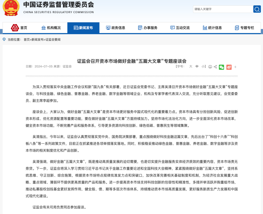 本報訊 (記者毛藝融)為深入貫徹落實中央金融工作會議和新“國九條”有關(guān)部署,近日,證監(jiān)會黨委書記、主席吳清召開資本市場做好金融“五篇大文章”專題座談會,與科技金融、綠色金融、普惠金融、養(yǎng)老金融、數(shù)字金融等領(lǐng)域企業(yè)、機構(gòu)及專家學者代表深入交流,充分聽取意見建議,會黨委委員、副主席李超參加。