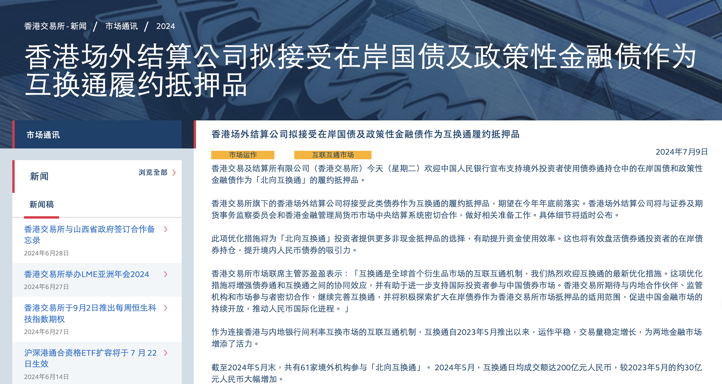 本報訊 (記者毛藝融)7月9日,香港交易所官網(wǎng)發(fā)布消息稱,歡迎中國人民銀行宣布支持境外投資者使用債券通持倉中的在岸國債和政策性金融債作為“北向互換通”的履約抵押品。