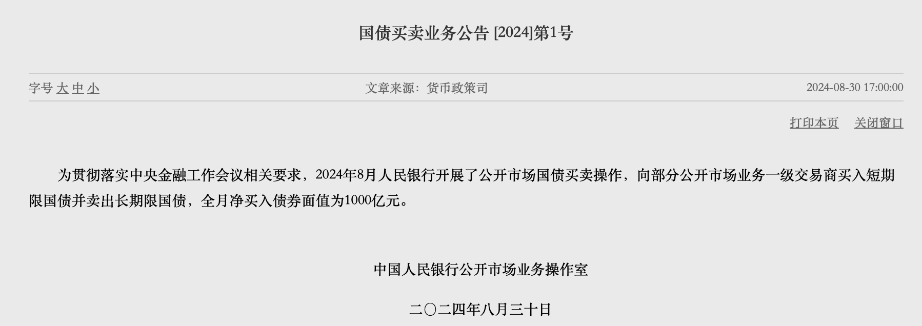 公告顯示,為貫徹落實中央金融工作會議相關(guān)要求,“2024年8月份人民銀行開展了公開市場國債買賣操作,向部分公開市場業(yè)務(wù)一級交易商買入短期限國債并賣出長期限國債,全月凈買入債券面值為1000億元”。