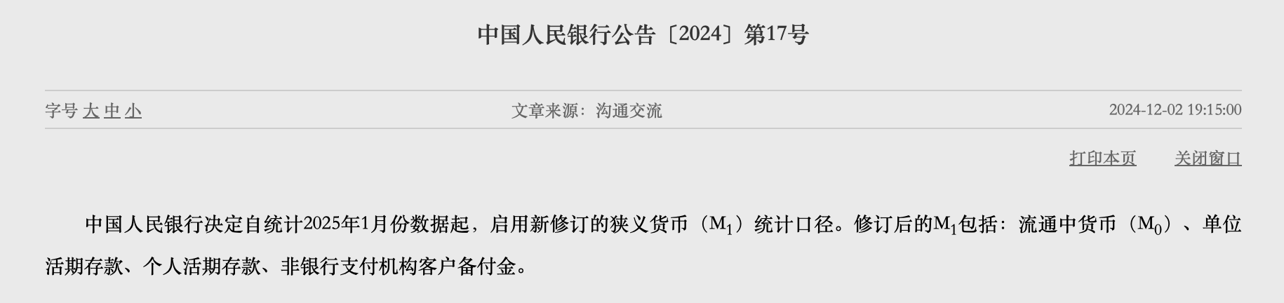 12月2日,中國人民銀行發(fā)布消息稱,中國人民銀行決定自統(tǒng)計(jì)2025年1月份數(shù)據(jù)起,啟用新修訂的狹義貨幣(M1)統(tǒng)計(jì)口徑。修訂后的M1包括:流通中貨幣(M0)、單位活期存款、個(gè)人活期存款、非銀行支付機(jī)構(gòu)客戶備付金。
