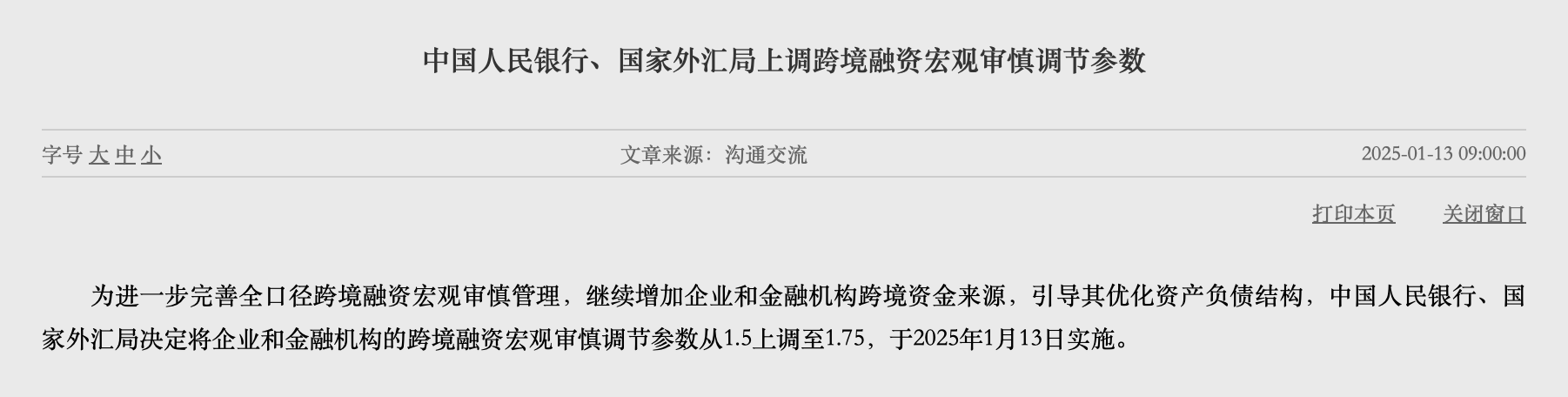 1月13日,中國人民銀行發(fā)布消息,為進一步完善全口徑跨境融資宏觀審慎管理,繼續(xù)增加企業(yè)和金融機構(gòu)跨境資金來源,引導(dǎo)其優(yōu)化資產(chǎn)負債結(jié)構(gòu),中國人民銀行、國家外匯局決定將企業(yè)和金融機構(gòu)的跨境融資宏觀審慎調(diào)節(jié)參數(shù)從1.5上調(diào)至1.75,于2025年1月13日實施。