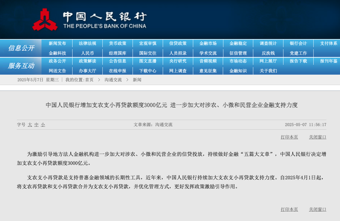 本報(bào)訊 (記者韓昱)中國(guó)人民銀行5月7日發(fā)布消息稱,為激勵(lì)引導(dǎo)地方法人金融機(jī)構(gòu)進(jìn)一步加大對(duì)涉農(nóng)、小微和民營(yíng)企業(yè)的信貸投放,持續(xù)做好金融“五篇大文章”,中國(guó)人民銀行決定增加支農(nóng)支小再貸款額度3000億元。