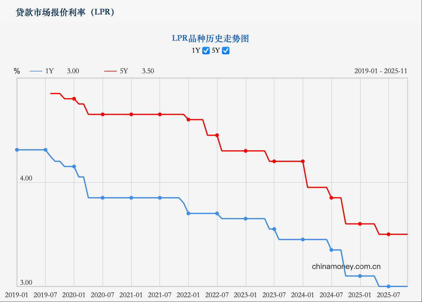 11月20日,中國人民銀行授權(quán)全國銀行間同業(yè)拆借中心公布,2025年11月20日貸款市場報(bào)價(jià)利率(LPR)為:1年期LPR為3.0%,5年期以上LPR為3.5%。兩個(gè)期限品種LPR較上月均維持不變。