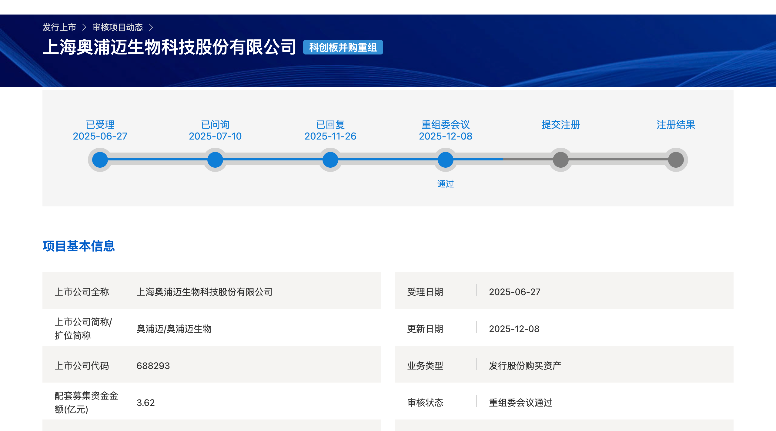 本報(bào)訊 (記者毛藝融)12月8日,上海奧浦邁生物科技股份有限公司(以下簡稱“奧浦邁”)發(fā)行股份購買資產(chǎn)申請獲上海證券交易所并購重組委審議通過。