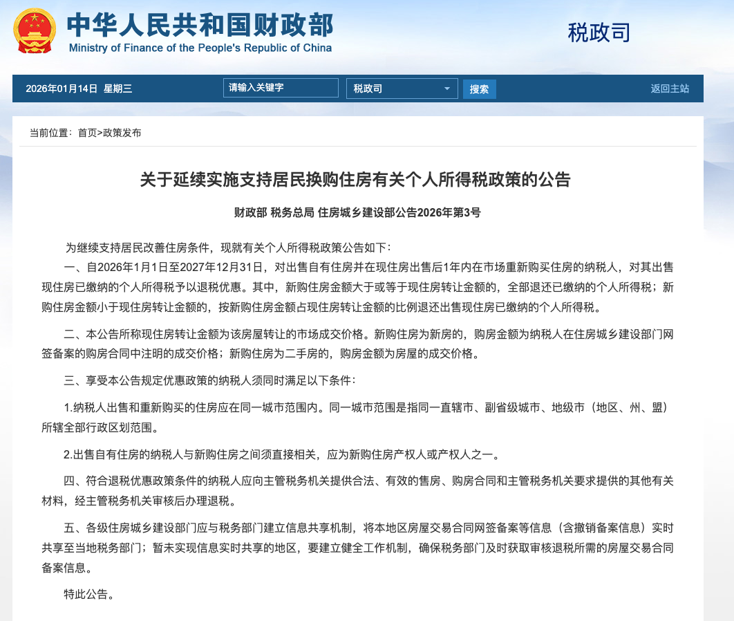 據(jù)財政部1月14日消息,財政部,稅務(wù)總局,住房城鄉(xiāng)建設(shè)部發(fā)布《關(guān)于延續(xù)實施支持居民換購住房有關(guān)個人所得稅政策的公告》(以下簡稱《公告》)。
