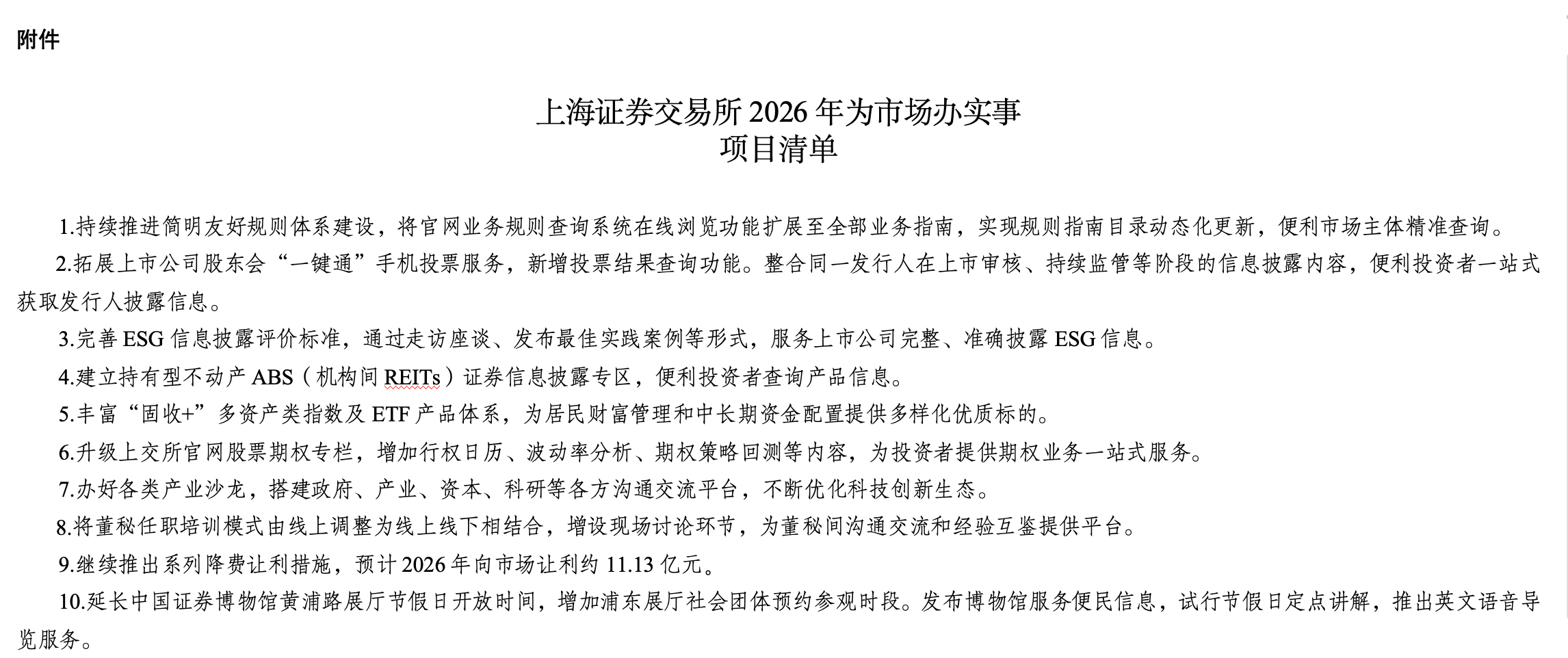 《項目清單》包括五個方面十件“實事”,覆蓋上交所上市審核、一線監(jiān)管、產品創(chuàng)新、市場服務、投資者保護、信息技術等主要業(yè)務領域。