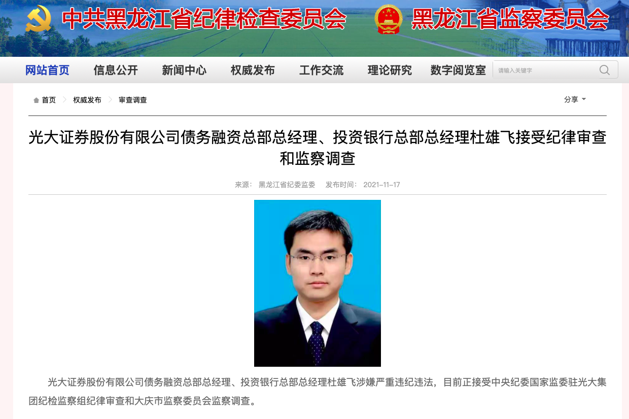 11月17日,黑龍江省紀(jì)委監(jiān)委網(wǎng)站顯示,光大證券股份有限公司債務(wù)融資總部總經(jīng)理、投資銀行總部總經(jīng)理杜雄飛涉嫌嚴(yán)重違紀(jì)違法,目前正接受中央紀(jì)委國(guó)家監(jiān)委駐光大集團(tuán)紀(jì)檢監(jiān)察組紀(jì)律審查和大慶市監(jiān)察委員會(huì)監(jiān)察調(diào)查。