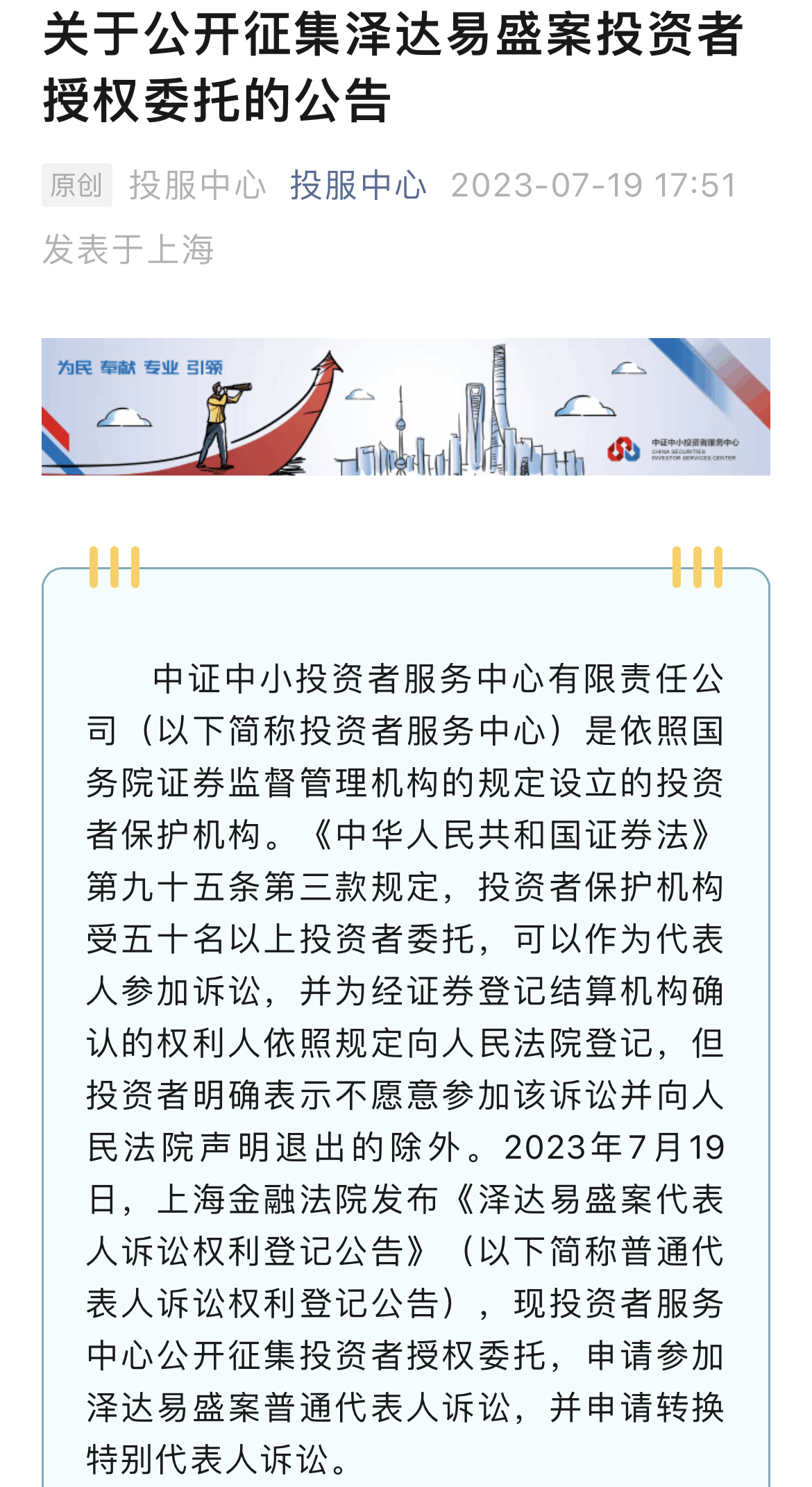 7月19日,在上海金融法院發(fā)布權(quán)利登記公告后,投服中心發(fā)布《關(guān)于公開(kāi)征集澤達(dá)易盛案投資者授權(quán)委托的公告》,公開(kāi)征集50名以上(含50名)投資者授權(quán)委托,申請(qǐng)參加澤達(dá)易盛案普通代表人訴訟,并申請(qǐng)轉(zhuǎn)換特別代表人訴訟。