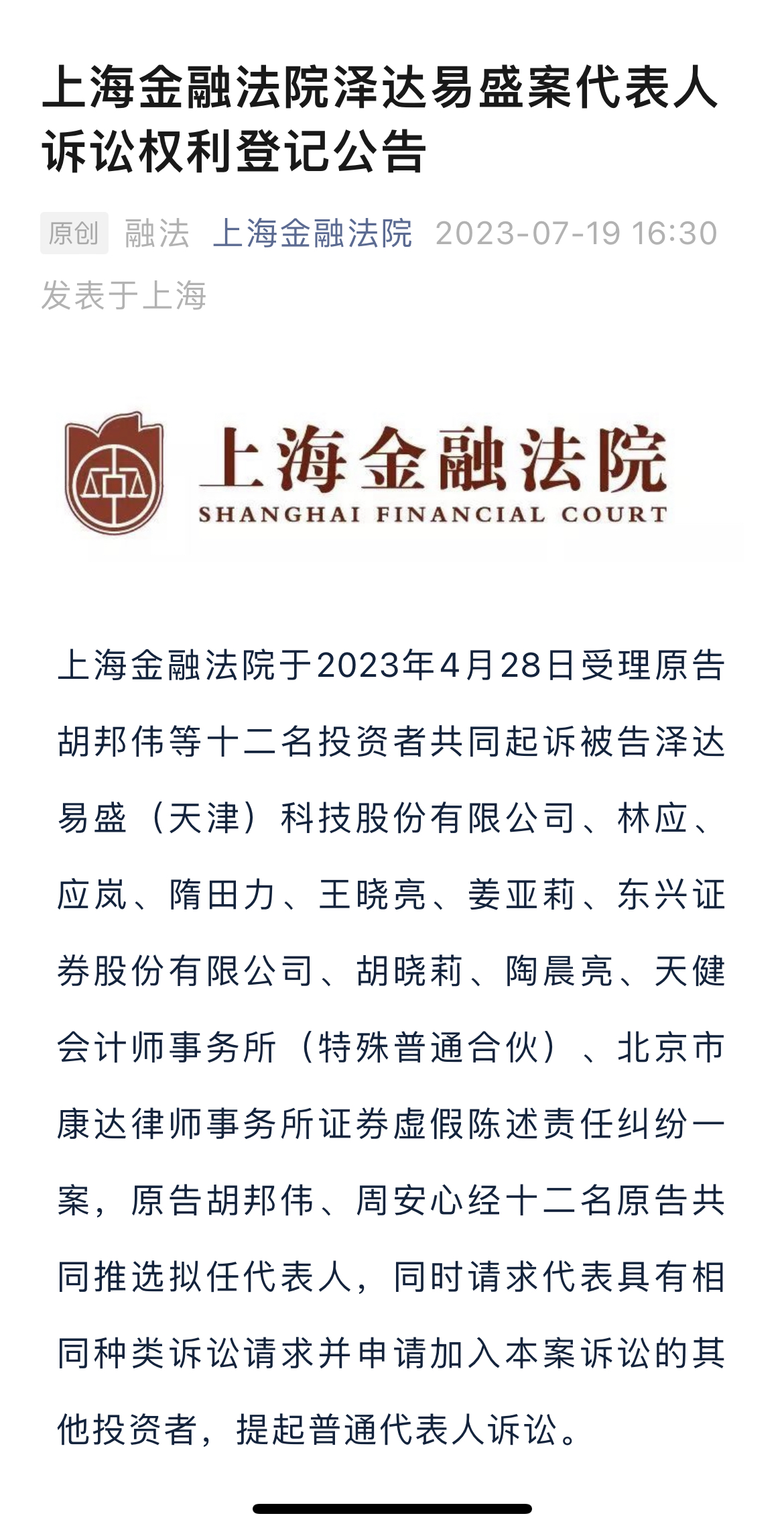 7月19日,上海金融法院發(fā)布《澤達(dá)易盛案代表人訴訟權(quán)利登記公告》。同日,投服中心公開(kāi)征集50名以上(含50名)投資者授權(quán)委托,申請(qǐng)參加澤達(dá)易盛案普通代表人訴訟,并申請(qǐng)轉(zhuǎn)換特別代表人訴訟。
