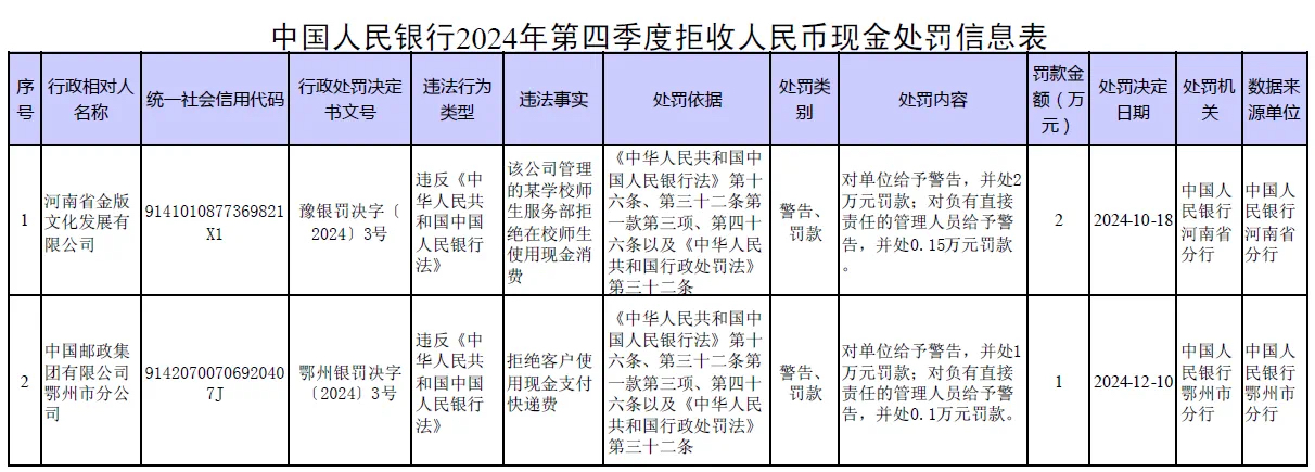 本報訊 (記者劉琪)1月23日,中國人民銀行(簡稱:央行)對2024年第四季度核實為拒收人民幣現(xiàn)金的2起經(jīng)濟處罰進(jìn)行公示。廣大經(jīng)營主體應(yīng)強化法治觀念,尊重公眾支付選擇權(quán),共同打造和諧現(xiàn)金流通環(huán)境。