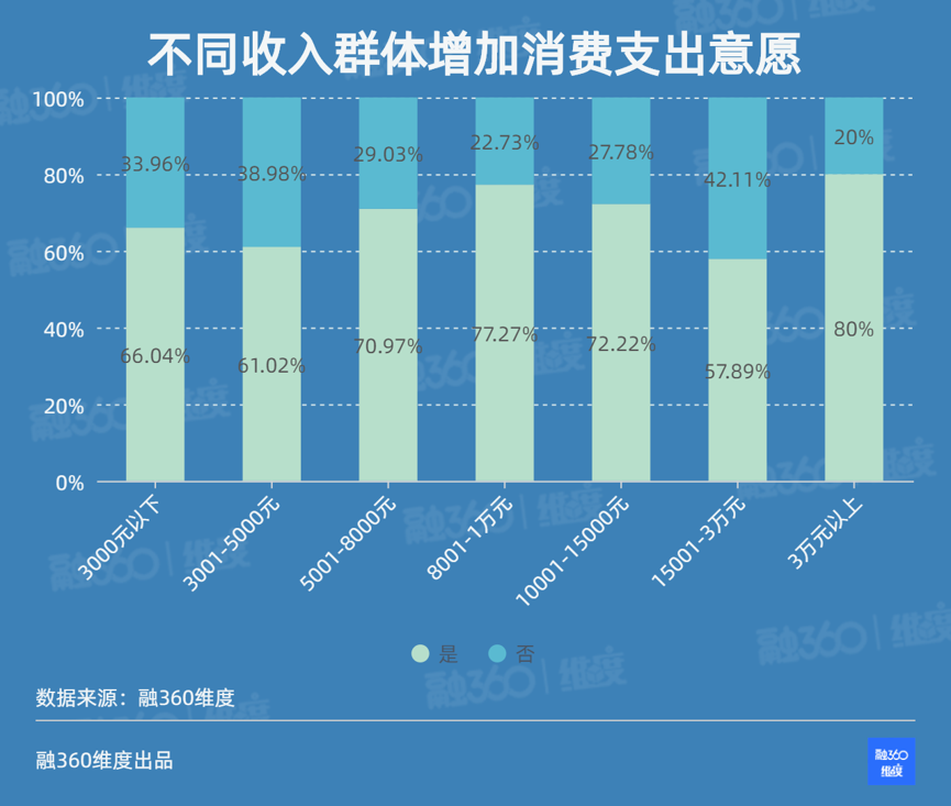 根據(jù)融360維度的調(diào)查結(jié)果,68.61%的人表示疫情結(jié)束后,短期內(nèi)有增加消費(fèi)支出的意愿。月收入在3萬(wàn)元以上的受訪者增加短期消費(fèi)支出的意愿最高,比例達(dá)到80%。