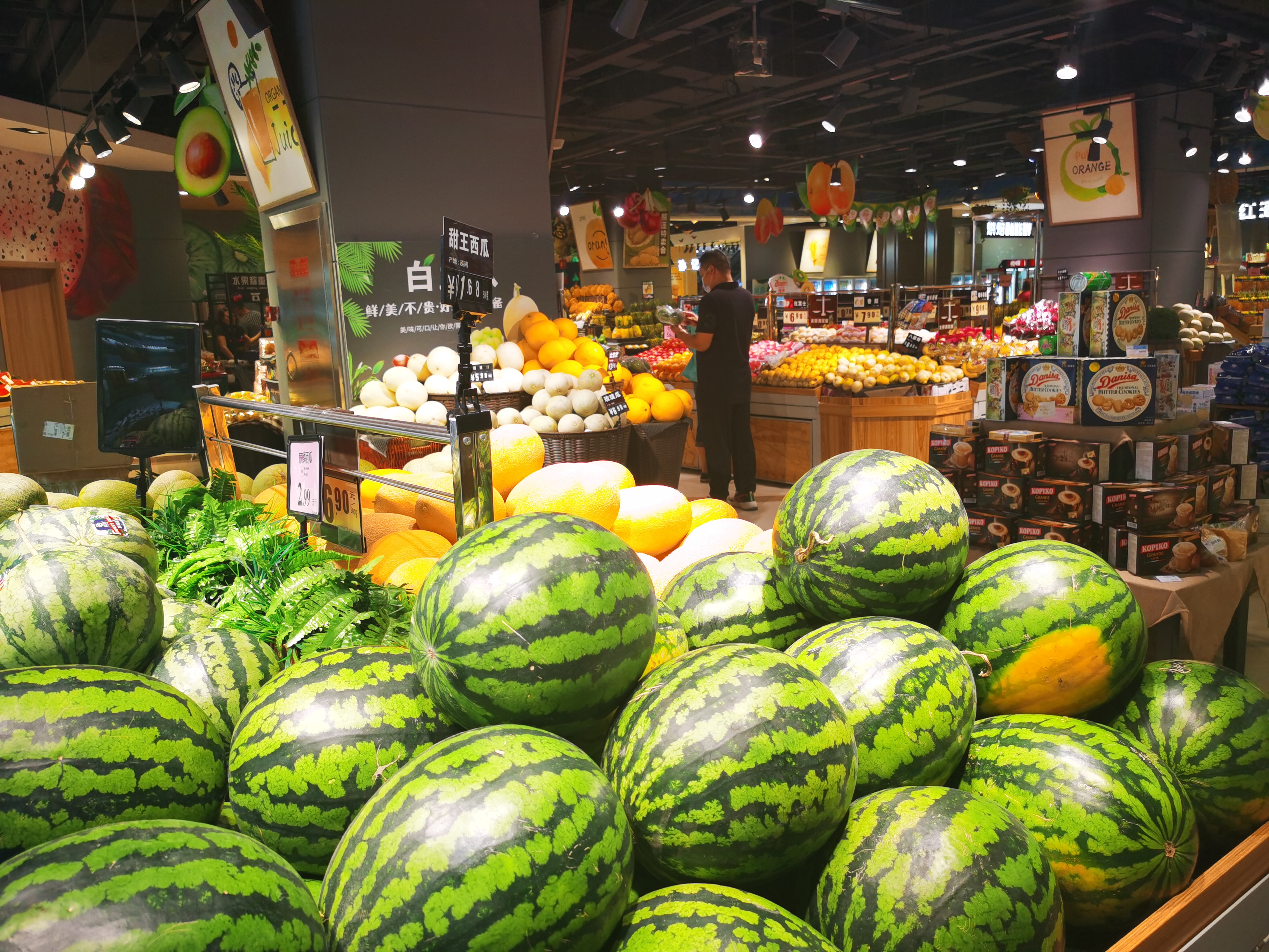 6月17日下午,沈陽(yáng)的氣溫攀升到了34攝氏度,在太原街中興商業(yè)的超市賣場(chǎng)中,各種商品琳瑯滿目。產(chǎn)自越南的甜王西瓜在這里的售價(jià)為1.68元/斤,新鮮的豬前腿肉售價(jià)為23.5/斤。在水產(chǎn)品柜臺(tái),有各式的海魚和淡水魚,還有新鮮的生蠔、扇貝和鮑魚等海產(chǎn)品售賣。其中8-10頭的鮮活鮑魚售價(jià)僅為7元/頭,還買一送一。