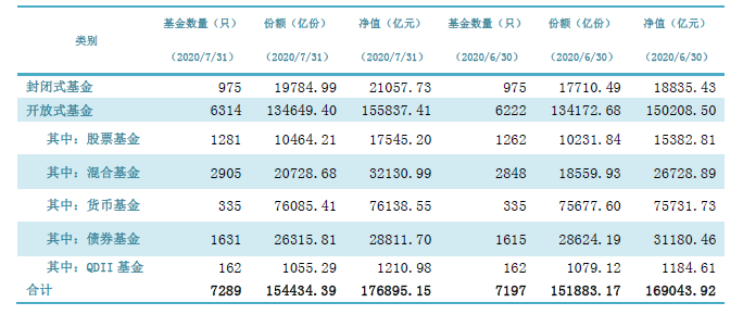 具體來看,據(jù)中國基金業(yè)協(xié)會發(fā)布的《公募基金市場數(shù)據(jù)(2020年7月)》顯示,開放式基金中,股票基金數(shù)量有1281只,凈值為17545.2億元,環(huán)比增長14.06%;混合基金2905只,凈值為32130.99億元,環(huán)比增長20.21%。貨幣基金和QDII基金規(guī)模也出現(xiàn)了小幅上漲,凈值分別為76138.55億元和1210.98億元,較6月末增長了0.54%和2.23%。