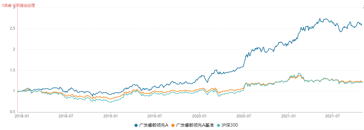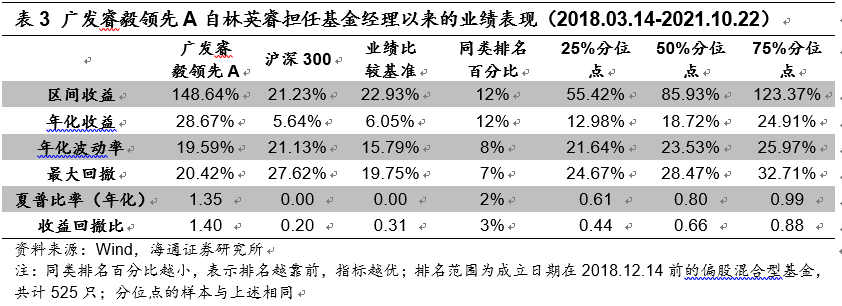自2017年12月到現(xiàn)在,林英睿管理廣發(fā)睿毅領先的4個完整年度中,僅2018年出現(xiàn)7.18%的跌幅,其他年份均為正收益?;鹱猿闪⒁詠恚鄢?個月建倉期)的年化夏普比率1.35。