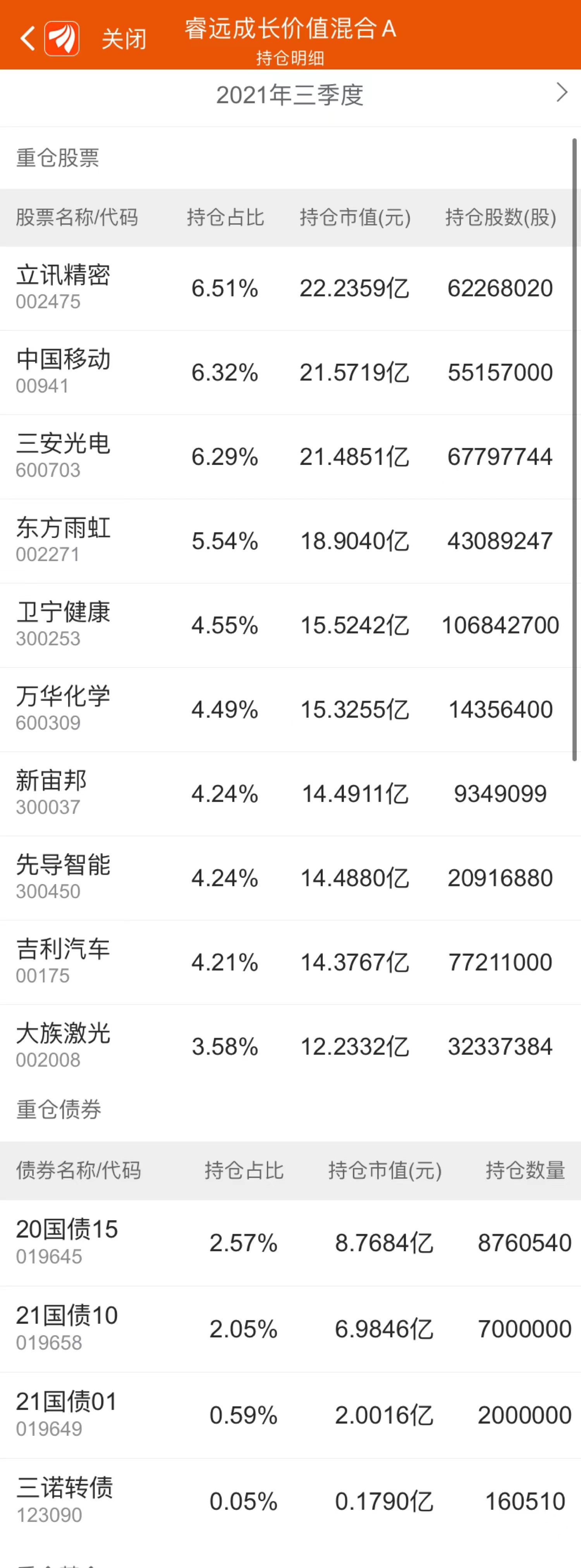 截至三季度末,該基金前十大重倉股為立訊精密、中國移動、三安光電、東方雨虹、衛(wèi)寧健康、萬華化學(xué)、新宙邦、先導(dǎo)智能、吉利汽車、大族激光。其中,立訊精密、萬華化學(xué)、吉利汽車、大族激光、三安光電、衛(wèi)寧健康獲得增持。
