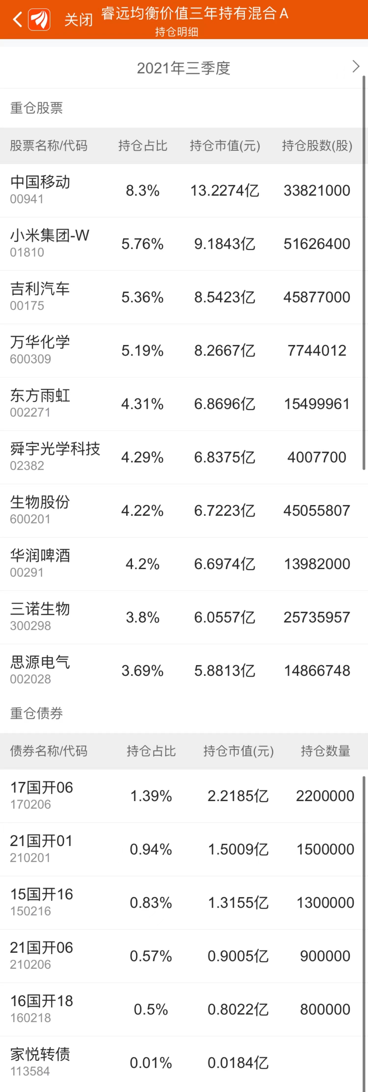 截至9月末,該基金前十大重倉股為中國移動、小米集團(tuán)-W、吉利汽車、萬華化學(xué)、東方雨虹、舜宇光學(xué)科技、生物股份、華潤啤酒、三諾生物、思源電氣。