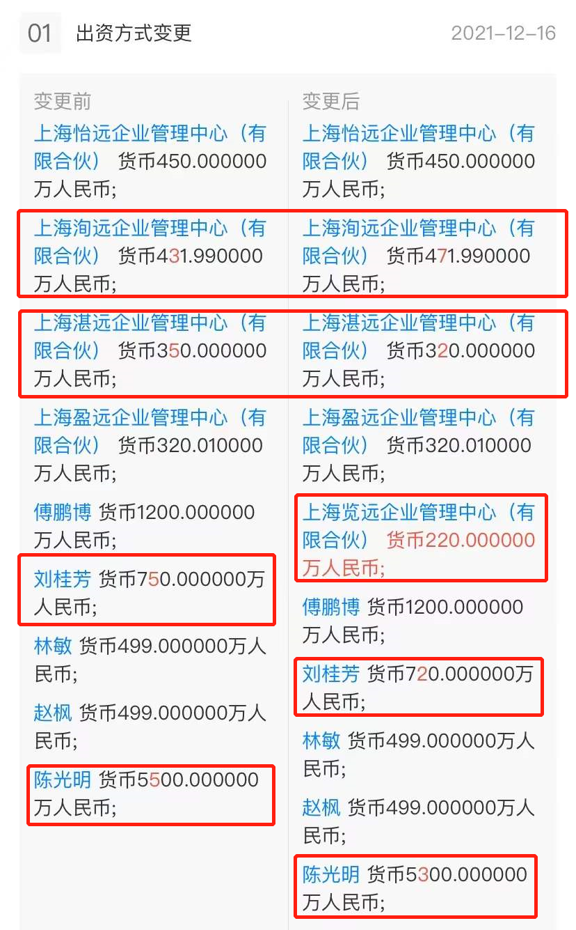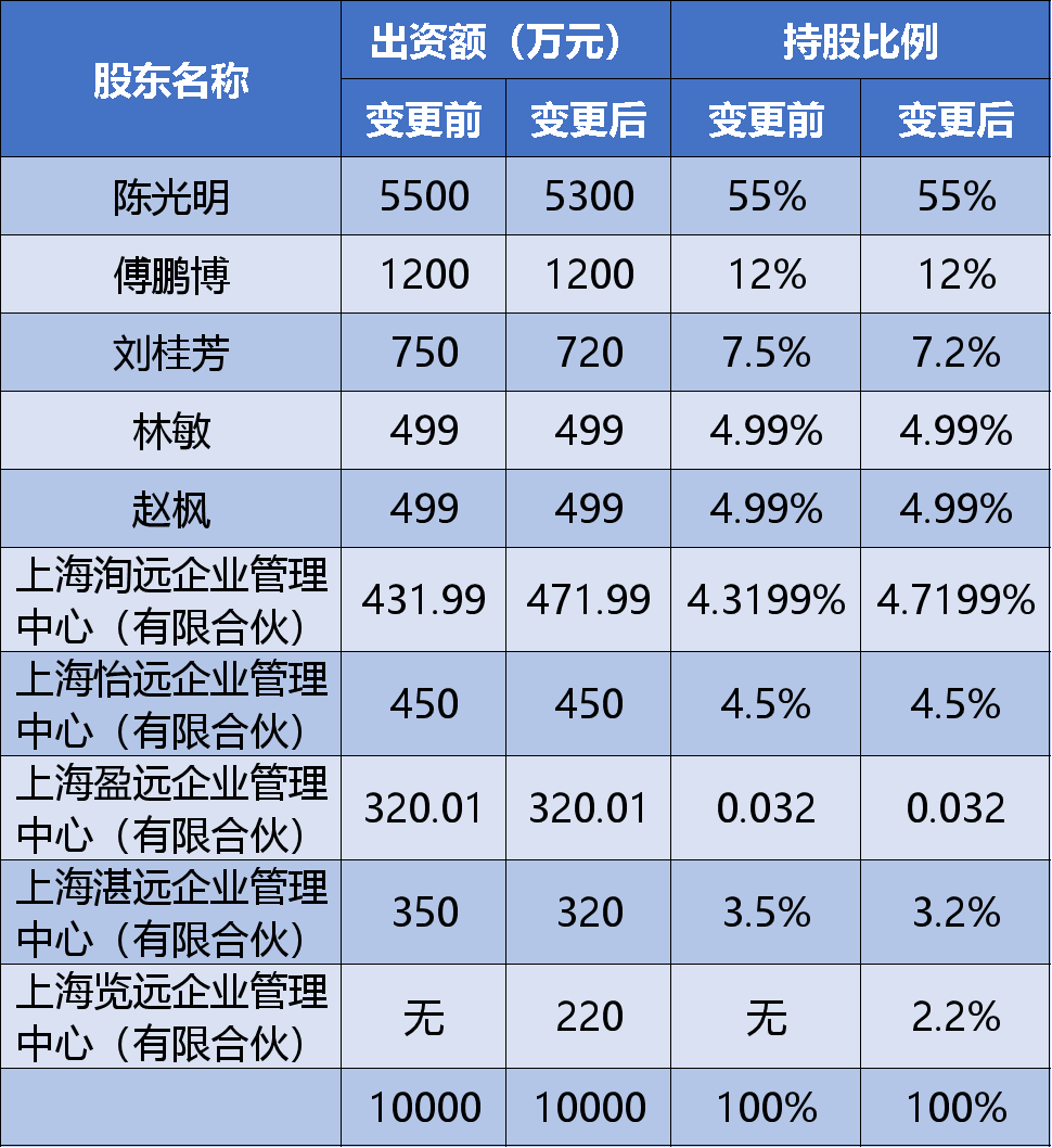 天眼查網(wǎng)站顯示,睿遠基金在2021年12月16日完成投資人(股權)變更,新增了上海覽遠企業(yè)管理中心(有限合伙)這一新的員工持股平臺。與之相對的是,公司總經(jīng)理陳光明、董事長劉桂芳在內(nèi)的幾個股東出資額小幅下滑。