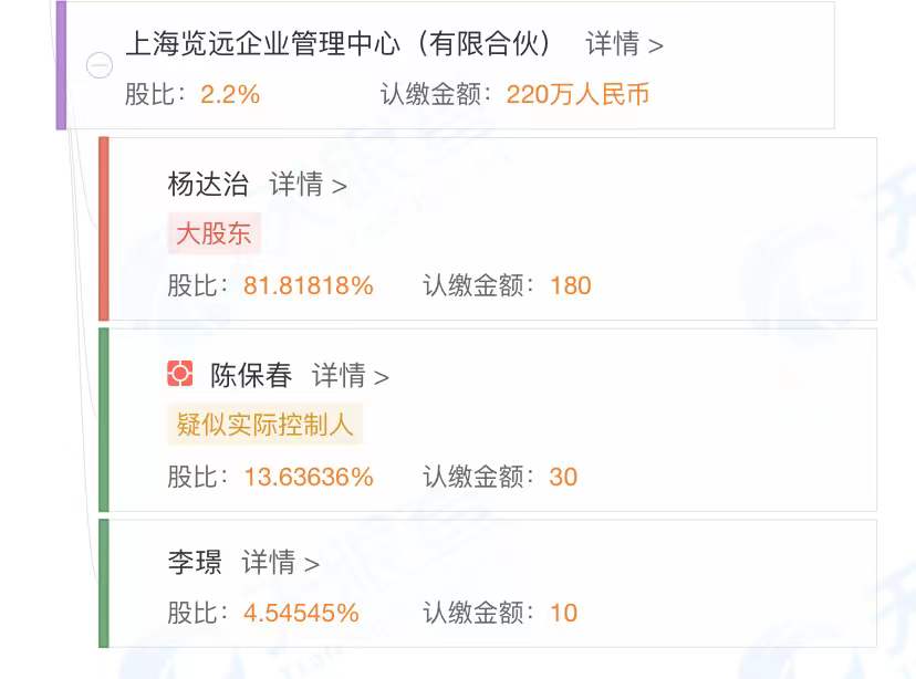 公開資料顯示,新增的上海覽遠企業(yè)管理中心(有限合伙)成立于2021年12月8日,股東分別為楊達治、陳保春和李璟。具體來看,上海覽遠企業(yè)管理中心(有限合伙)合計認繳220萬元,其中,楊達治、陳保春、李璟三人分別認繳180萬元、30萬元、10萬元,合計持有睿遠基金2.2%股權,成為睿遠基金新進的第十大股東。