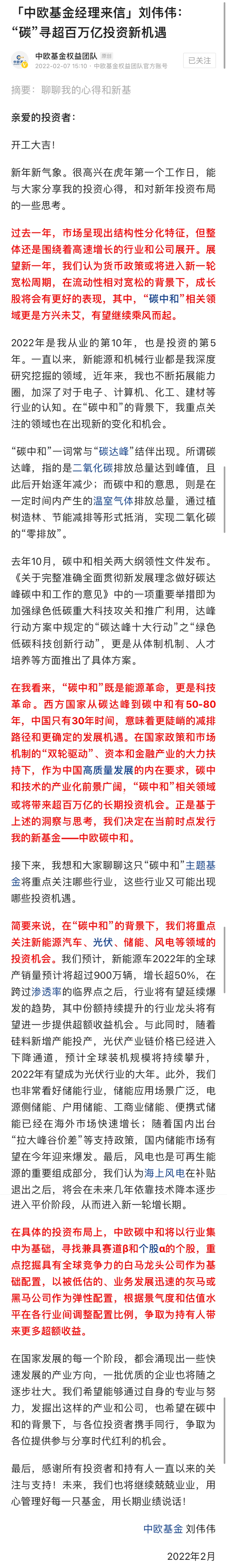 在致投資者的一封信中,劉偉偉提到,很高興在虎年第一個(gè)工作日,能與大家分享我的投資心得,和對(duì)新年投資布局的一些思考。展望2022年,在“碳中和”的背景下,我們將重點(diǎn)關(guān)注新能源汽車(chē)、光伏、儲(chǔ)能、風(fēng)電等領(lǐng)域的投資機(jī)會(huì)。