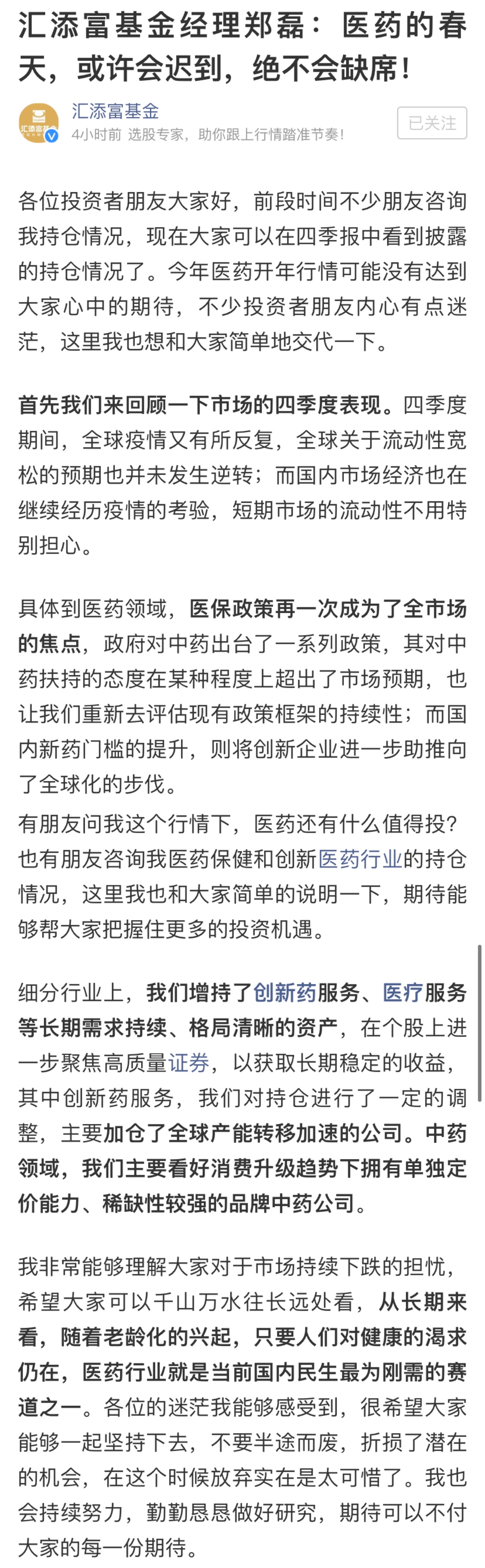 主攻醫(yī)藥賽道的鄭磊則對(duì)投資者坦言,”我非常能夠理解大家對(duì)于市場(chǎng)持續(xù)下跌的擔(dān)憂(yōu),希望大家可以千山萬(wàn)水往長(zhǎng)遠(yuǎn)處看,從長(zhǎng)期來(lái)看,隨著老齡化的興起,只要人們對(duì)健康的渴求仍在,醫(yī)藥行業(yè)就是當(dāng)前國(guó)內(nèi)民生最為剛需的賽道之一。各位的迷茫我能夠感受到,很希望大家能夠一起堅(jiān)持下去,不要半途而廢,折損了潛在的機(jī)會(huì),在這個(gè)時(shí)候放棄實(shí)在是太可惜了。我也會(huì)持續(xù)努力,勤勤懇懇做好研究,期待可以不付大家的每一份期待。“