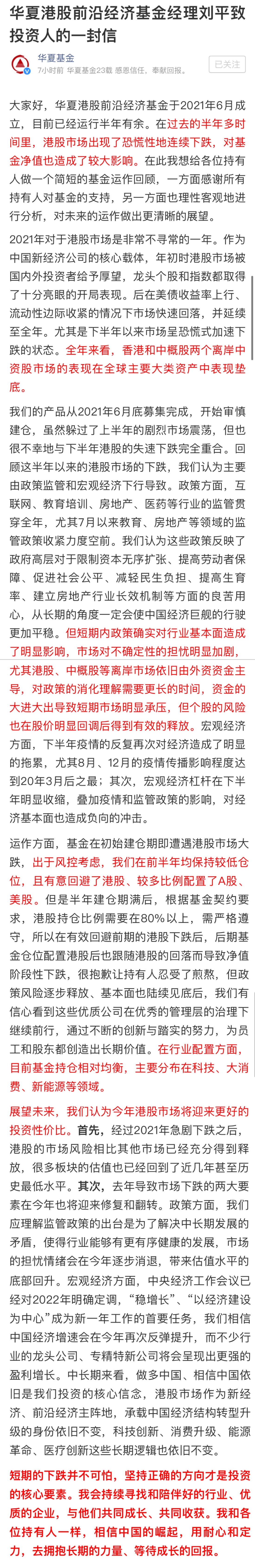 基金經(jīng)理劉平同樣對(duì)港股市場(chǎng)投資進(jìn)行了研判。她在信中寫(xiě)道,”在過(guò)去的半年多時(shí)間里,港股市場(chǎng)出現(xiàn)了恐慌性地連續(xù)下跌,對(duì)基金凈值也造成了較大影響。在此我想給各位持有人做一個(gè)簡(jiǎn)短的基金運(yùn)作回顧,一方面感謝所有持有人對(duì)基金的支持,另一方面也理性客觀地進(jìn)行分析,對(duì)未來(lái)的運(yùn)作做出更清晰的展望。”