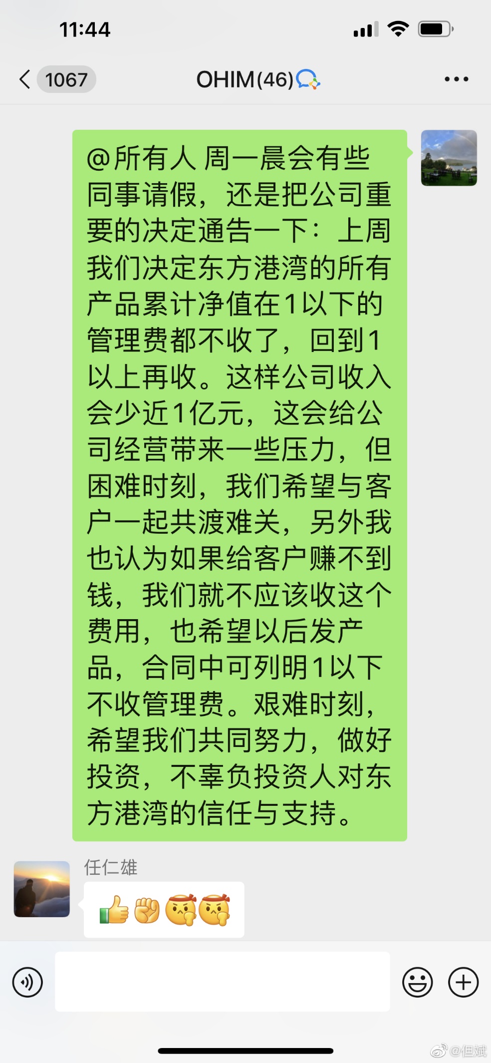 但斌還表示,“另外,我認為如果客戶賺不到錢,我們就不應該收這個費用,也希望以后發(fā)產(chǎn)品,合同中可列明1以下不收管理費。目前我們正在與各渠道溝通協(xié)調(diào),艱難時刻,希望我們共同努力,做好投資,不辜負投資人對東方港灣的信任與支持。”