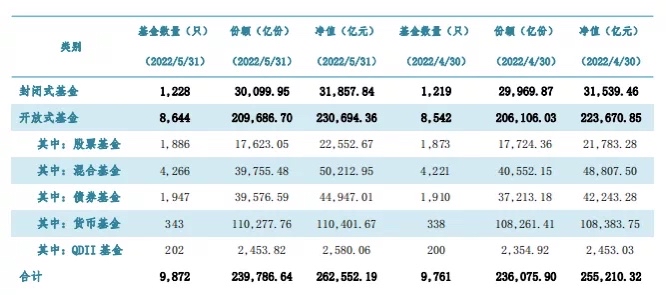 6月29日晚間,中國基金業(yè)協(xié)會發(fā)布2022年5月份公募基金市場數(shù)據(jù)。數(shù)據(jù)顯示,截至2022年5月底,公募基金資產(chǎn)凈值合計26.26萬億元,較4月底的25.52萬億元環(huán)比增長2.9%。