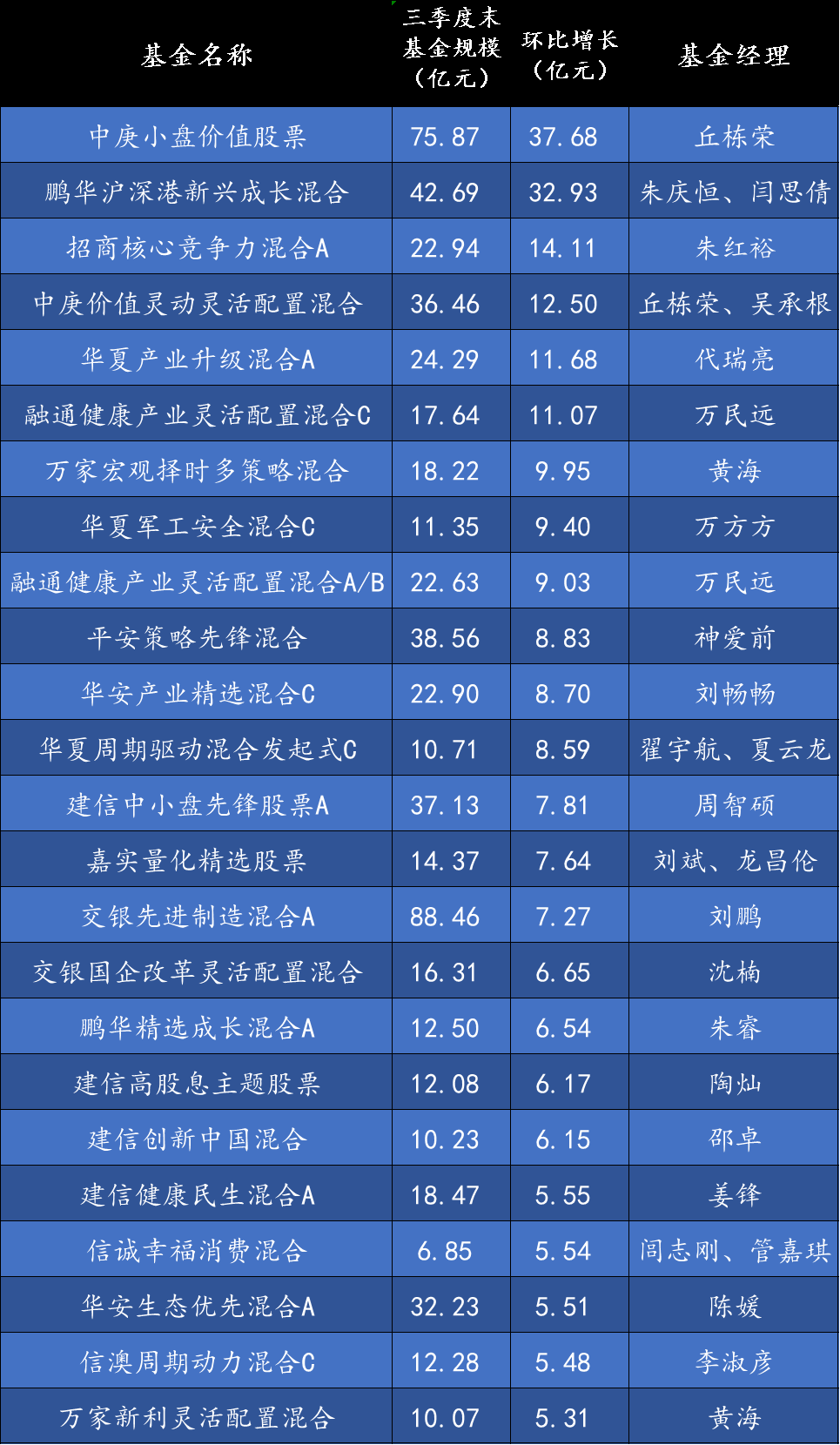 丘棟榮管理的中庚小盤價值股票在三季度期間規(guī)模增長最為突出,環(huán)比增長42.38億元,他旗下所管的中庚價值靈動靈活配置混合在報告期內(nèi)同樣增長12.5億元。緊隨其后的是朱慶恒和閆思倩共同管理的鵬華滬深港新興成長混合,報告期內(nèi)規(guī)模增長32.93億元。