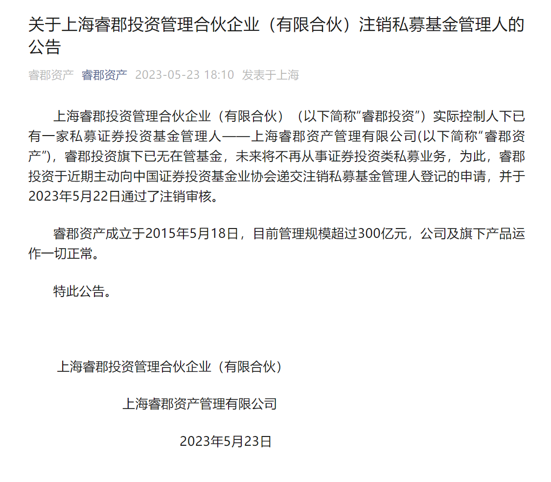 5月23日下午6點(diǎn)10分,??べY產(chǎn)官網(wǎng)發(fā)布《關(guān)于上海睿郡投資管理合伙企業(yè)(有限合伙)注銷(xiāo)私募基金管理人的公告》。公告聲明稱(chēng),上海??ね顿Y管理合伙企業(yè)(有限合伙)(以下簡(jiǎn)稱(chēng)“??ね顿Y”)實(shí)際控制人下已有一家私募證券投資基金管理人——上海睿郡資產(chǎn)管理有限公司(以下簡(jiǎn)稱(chēng)“??べY產(chǎn)”),??ね顿Y旗下已無(wú)在管基金,未來(lái)將不再?gòu)氖伦C券投資類(lèi)私募業(yè)務(wù),為此,??ね顿Y于近期主動(dòng)向中基協(xié)遞交注銷(xiāo)私募基金管理人登記的申請(qǐng),并于2023年5月22日通過(guò)了注銷(xiāo)審核。