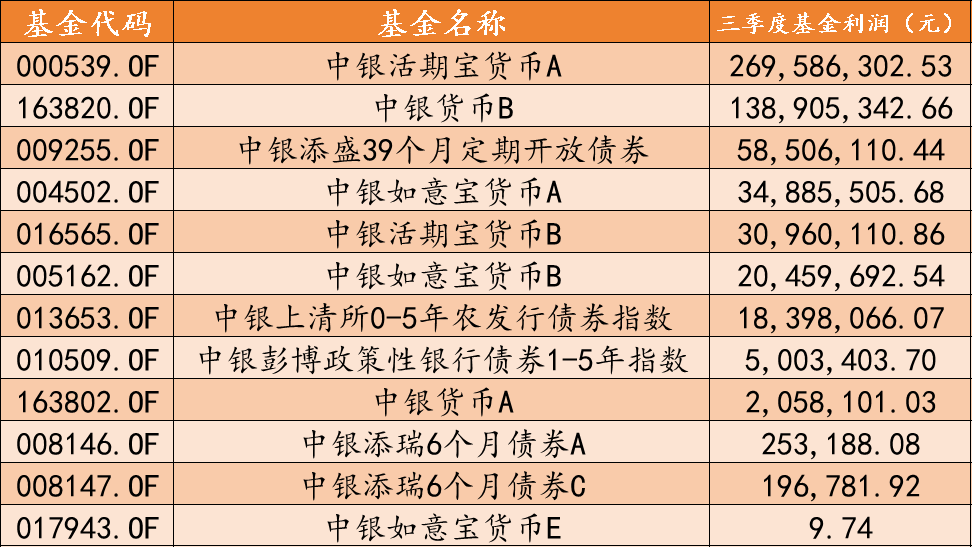 其中中銀活期寶貨幣市場基金A在三季度期間的基金利潤實(shí)現(xiàn)2.7億元,中銀貨幣市場證券投資基金B(yǎng)在三季度期間的基金利潤實(shí)現(xiàn)1.39億元。