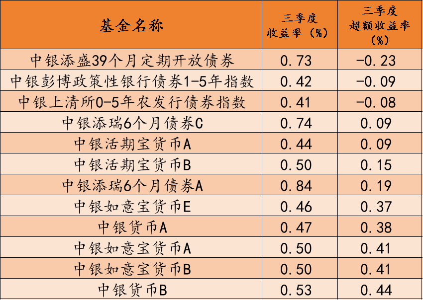 不過,也有中銀添盛39個(gè)月定期開放債券型證券投資基金、中銀榮享債券、中銀彭博政策性銀行債券1-5年指數(shù)證券投資基金、中銀上海清算所0-5年農(nóng)發(fā)行債券指數(shù)證券投資基金微幅跑輸同期業(yè)績比較基準(zhǔn),分別跑輸0.23個(gè)百分點(diǎn)、0.09個(gè)百分點(diǎn)和0.08個(gè)百分點(diǎn)。