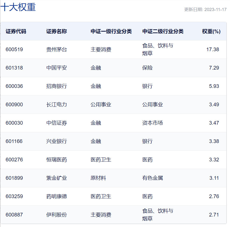 匯聚優(yōu)質(zhì)大盤(pán)藍(lán)籌股是上證50指數(shù)的一大亮點(diǎn),成份股中行業(yè)龍頭企業(yè)繁多。其中,成份股中權(quán)重較高的有消費(fèi)行業(yè)龍頭企業(yè)貴州茅臺(tái)、伊利股份等,金融行業(yè)中的中國(guó)平安、招商銀行等,公共事業(yè)行業(yè)的長(zhǎng)江電力、原材料行業(yè)的紫金礦業(yè)、醫(yī)藥衛(wèi)生行業(yè)的恒瑞醫(yī)藥等。