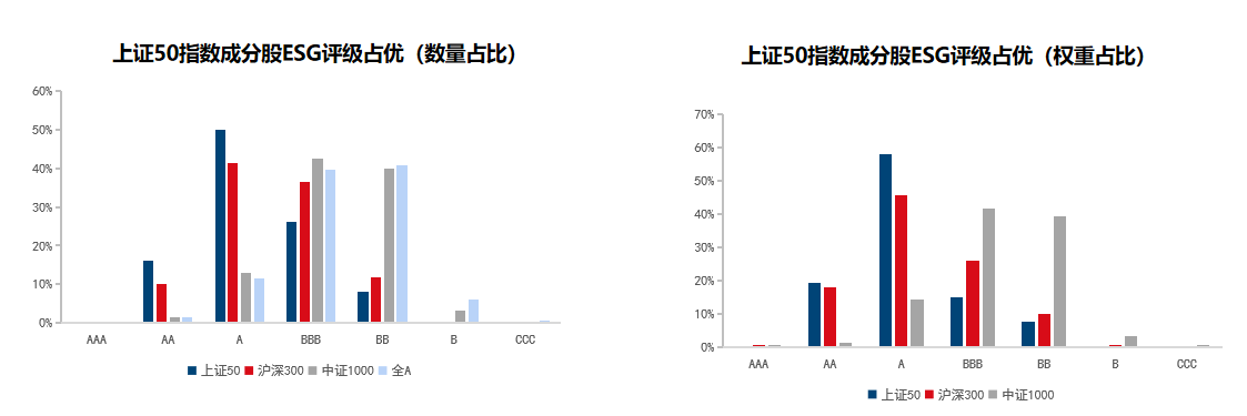 值得注意的是,近年來(lái)ESG投資理念持續(xù)滲透,注重投資組合的ESG評(píng)級(jí)有助于提升業(yè)績(jī)報(bào)酬、規(guī)避尾部風(fēng)險(xiǎn)。在主要寬基指數(shù)中,上證50指數(shù)更符合ESG投資理念,其ESG屬性較為突出。