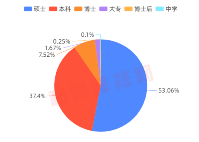 從私募基金經(jīng)理的最高學(xué)歷分布來(lái)看,全部有學(xué)歷統(tǒng)計(jì)的合計(jì)5254人,其中,碩士學(xué)歷占比最多,達(dá)53.06%;本科學(xué)歷和博士學(xué)歷則分別達(dá)37.4%、7.52%;此外,大專(zhuān)、博士后、大專(zhuān)以下學(xué)歷占比分別為1.67%、0.25%、0.1%。