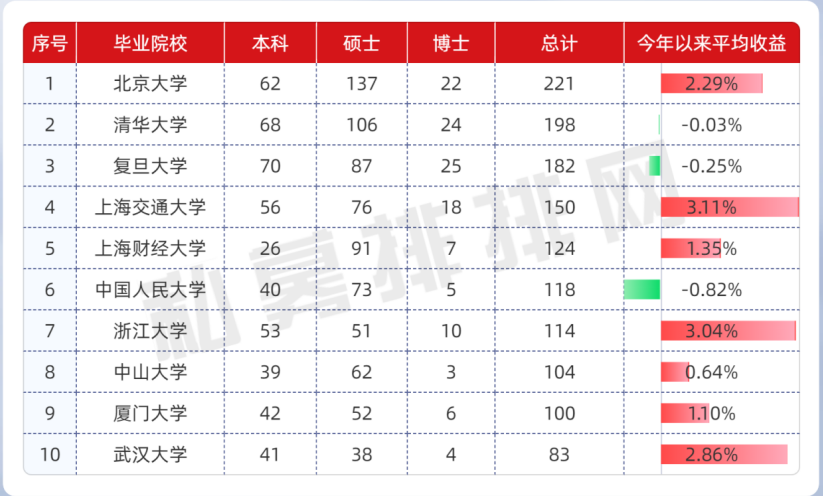 另從數(shù)量排名前十院校畢業(yè)的基金經(jīng)理業(yè)績(jī)來(lái)看,“上海交大系”“浙大系”私募基金經(jīng)理今年以來(lái)平均收益率均在3%以上,分別為3.11%、3.04%;“武大系”“北大系”私募基金經(jīng)理今年以來(lái)平均收益率分別為2.86%、2.29%。