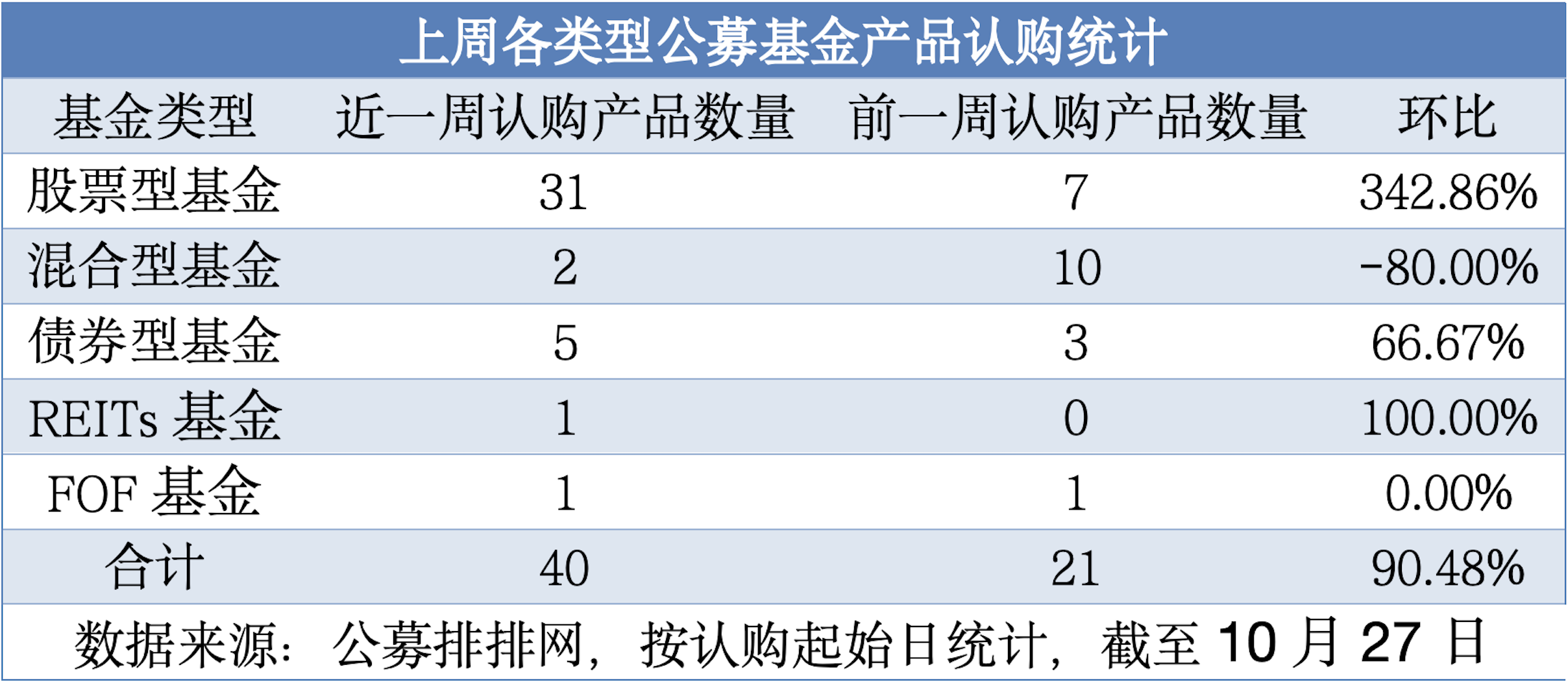 公募排排網(wǎng)數(shù)據(jù)顯示,截至10月27日,按基金認(rèn)購起始日統(tǒng)計(jì),近一周共有40只基金開啟認(rèn)購,較前一周的21只相比,環(huán)比大幅增長(zhǎng)90.48%。