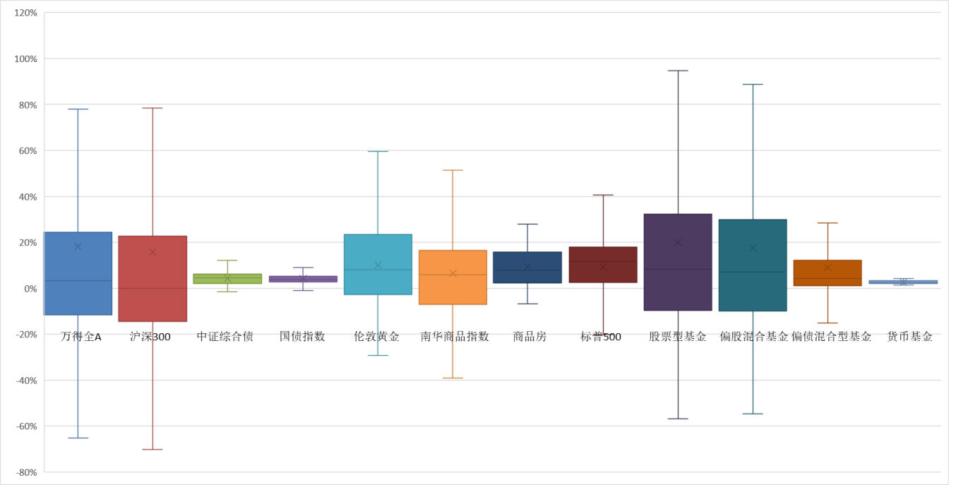 圖:各類資產(chǎn)持有十年年化收益率分布