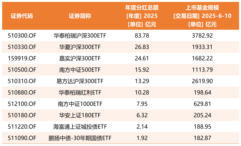Wind資訊數(shù)據(jù)顯示,截至6月10日,華泰柏瑞滬深300ETF規(guī)模達(dá)3782.92億元,基金份額為952.06億份。這意味著,若權(quán)益登記日前產(chǎn)品份額無較大變化,根據(jù)基金分紅公告,本次華泰柏瑞滬深300ETF分紅總額將超過80億元,這一數(shù)字有望刷新境內(nèi)ETF有史以來最高單次分紅紀(jì)錄。