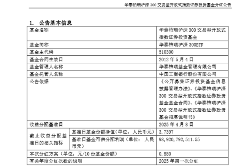 6月11日,華泰柏瑞基金發(fā)布公告稱,旗下滬深300ETF將實施現(xiàn)金分紅,分紅方案為每10份基金份額分紅0.880元,分紅權(quán)益登記日為2025年6月17日,除息日為2025年6月18日,現(xiàn)金紅利發(fā)放日為2025年6月27日。