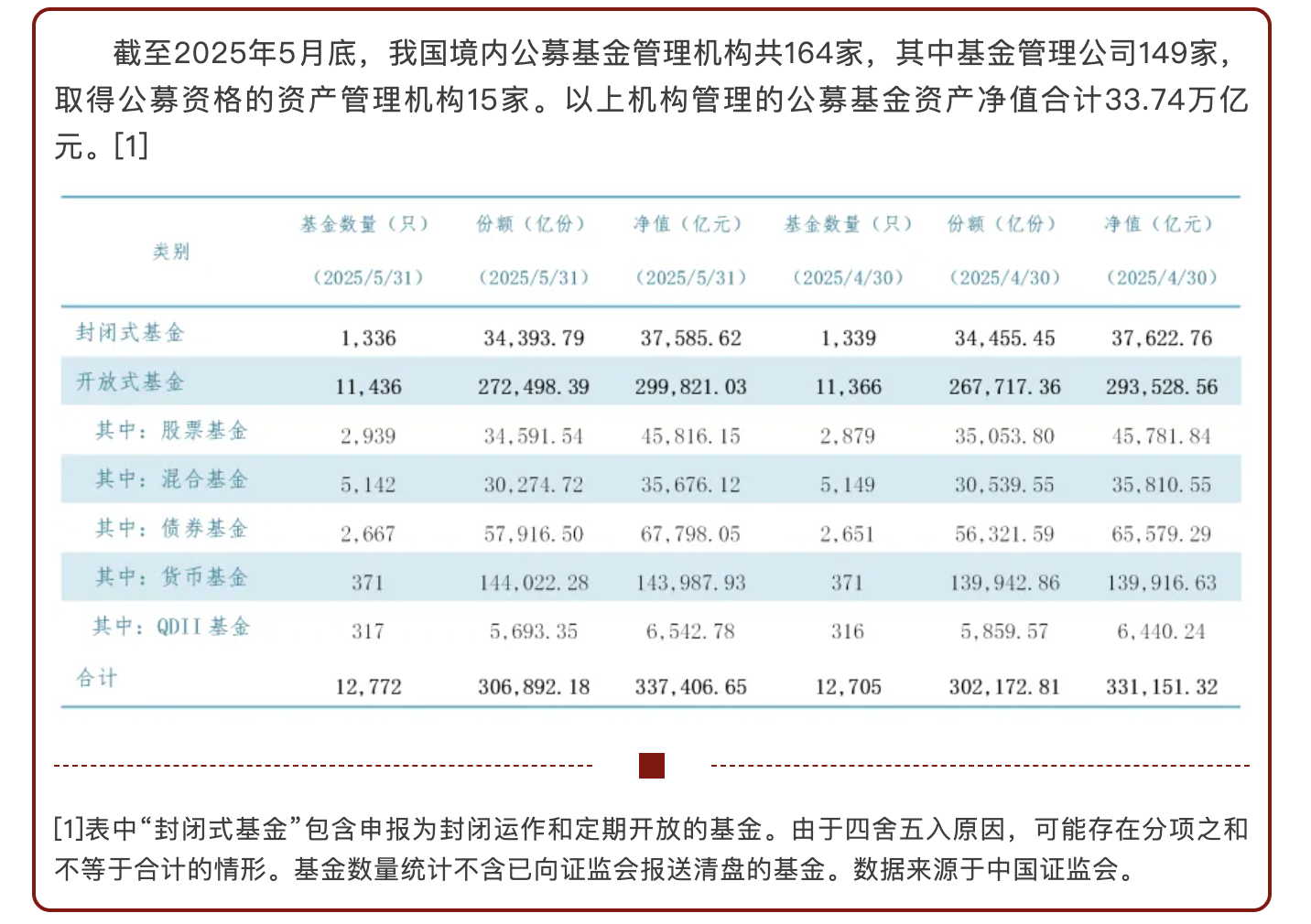 6月26日,中國證券投資基金業(yè)協(xié)會發(fā)布的最新數(shù)據(jù)顯示,截至2025年5月底,我國境內(nèi)公募基金管理機構(gòu)共164家,其中基金管理公司149家,取得公募資格的資產(chǎn)管理機構(gòu)15家。以上機構(gòu)管理的公募基金資產(chǎn)凈值合計33.74萬億元。