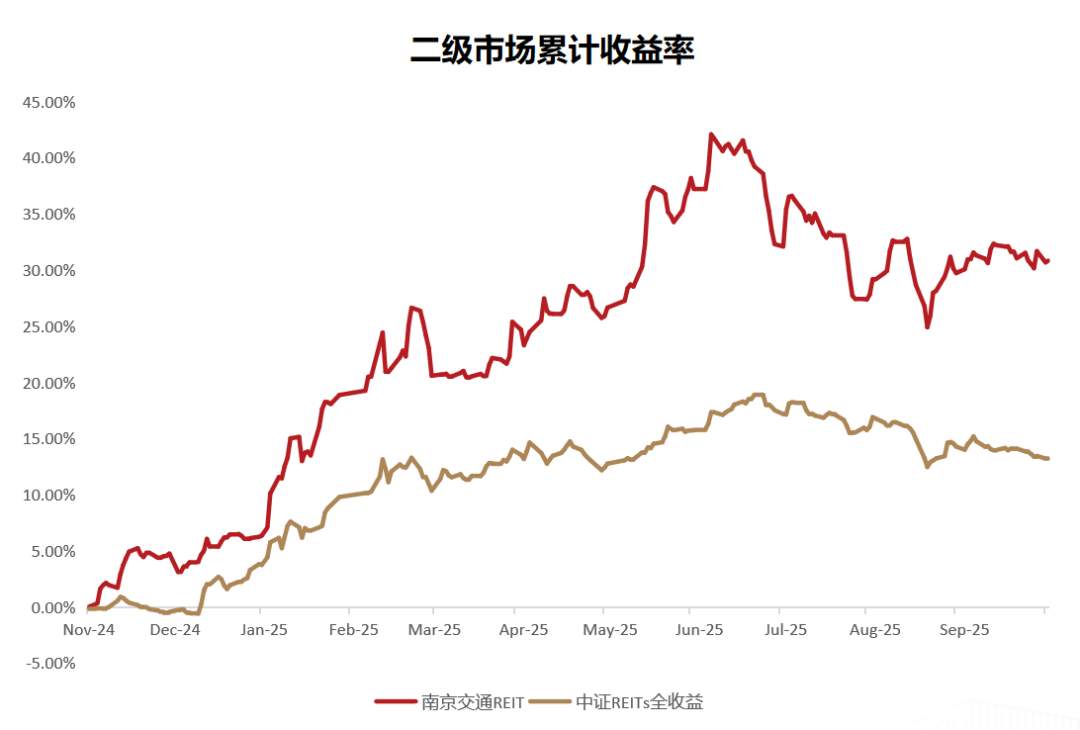二級(jí)市場(chǎng)穩(wěn)健顯優(yōu)勢(shì):截至2025年9月30日,產(chǎn)品上市以來(lái)二級(jí)市場(chǎng)漲幅為30.84%,本產(chǎn)品二級(jí)市場(chǎng)漲幅領(lǐng)先中證REITs全收益指數(shù)(13.18%),是投資者積極配置的優(yōu)質(zhì)標(biāo)的,展現(xiàn)了市場(chǎng)對(duì)本產(chǎn)品經(jīng)營(yíng)能力對(duì)長(zhǎng)期價(jià)值的認(rèn)可。
