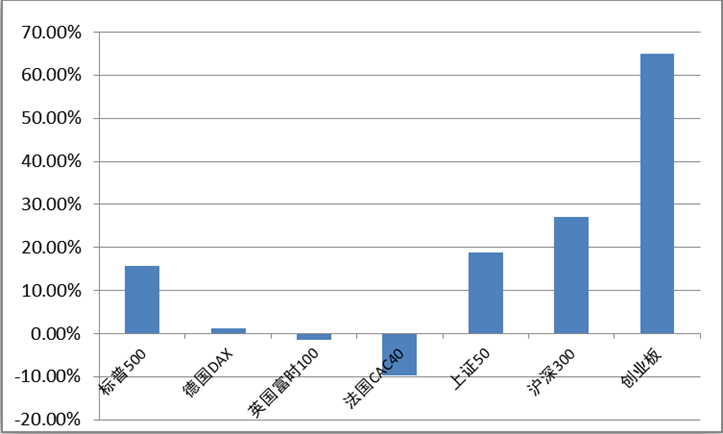 2020年的新冠疫情造成了巨大的沖擊,各國央行為應(yīng)對經(jīng)濟(jì)下滑積極釋放流動性,但因為隔離等防疫政策導(dǎo)致的制造業(yè)停滯,大量無處可去的資金流入了資本市場。我們看到,全球股市在一季度大跌之后,均陸續(xù)開啟反彈行情,其中A股依靠更快的基本面復(fù)蘇表現(xiàn)亮眼。全年來看,標(biāo)普500上漲15.62%,德國DAX也累計微漲1.28%,但同期英國富時100和法國CAC40仍累計下跌1.54%和9.78%。得益于中國對疫情的成功控制和順利復(fù)工復(fù)產(chǎn)所帶來的基本面優(yōu)勢,上證50、滬深300和創(chuàng)業(yè)板在2020年分別上漲18.85%、27.21%和64.96%,在全球市場中名列前茅。