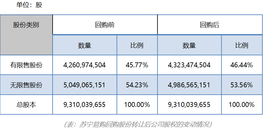 根據(jù)擬定的回購方案,蘇寧易購預(yù)計出資不超過10億元從二級市場回購股份,按照回購價格16元計算,約為6250萬股,占公司總股本約0.67%。若回購股份全部用于員工股權(quán)激勵計劃,則回購股份轉(zhuǎn)讓后公司有限售股份比例由45.77%增至46.44%。