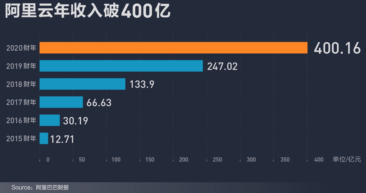 2020財年第四季度內(nèi),阿里云營收達122億元,環(huán)比大幅增長,單季度收入連續(xù)第二個季度突破百億元大關。對比歷史數(shù)據(jù),2015財年阿里巴巴首次披露云計算營收,當年阿里云收入為12.71億元,到2020財年營收400億元,6年間增長了31倍。